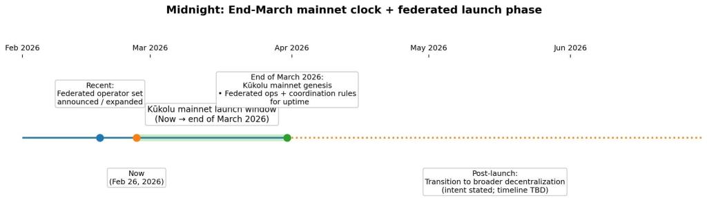 Midnight’s Kūkolu mainnet launches at the end of March 2026 with federated operators, with a transition to broader decentralization planned but not yet scheduled.