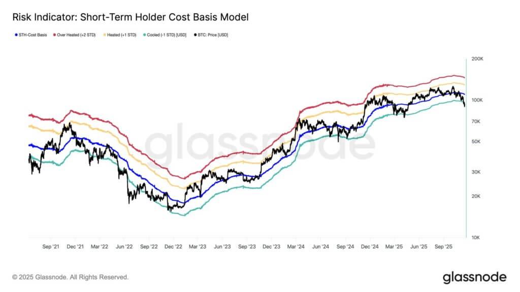 Bitcoin price trades below the short-term holder cost basis and cooling bands, indicating recent buyers are underwater amid the current drawdown.